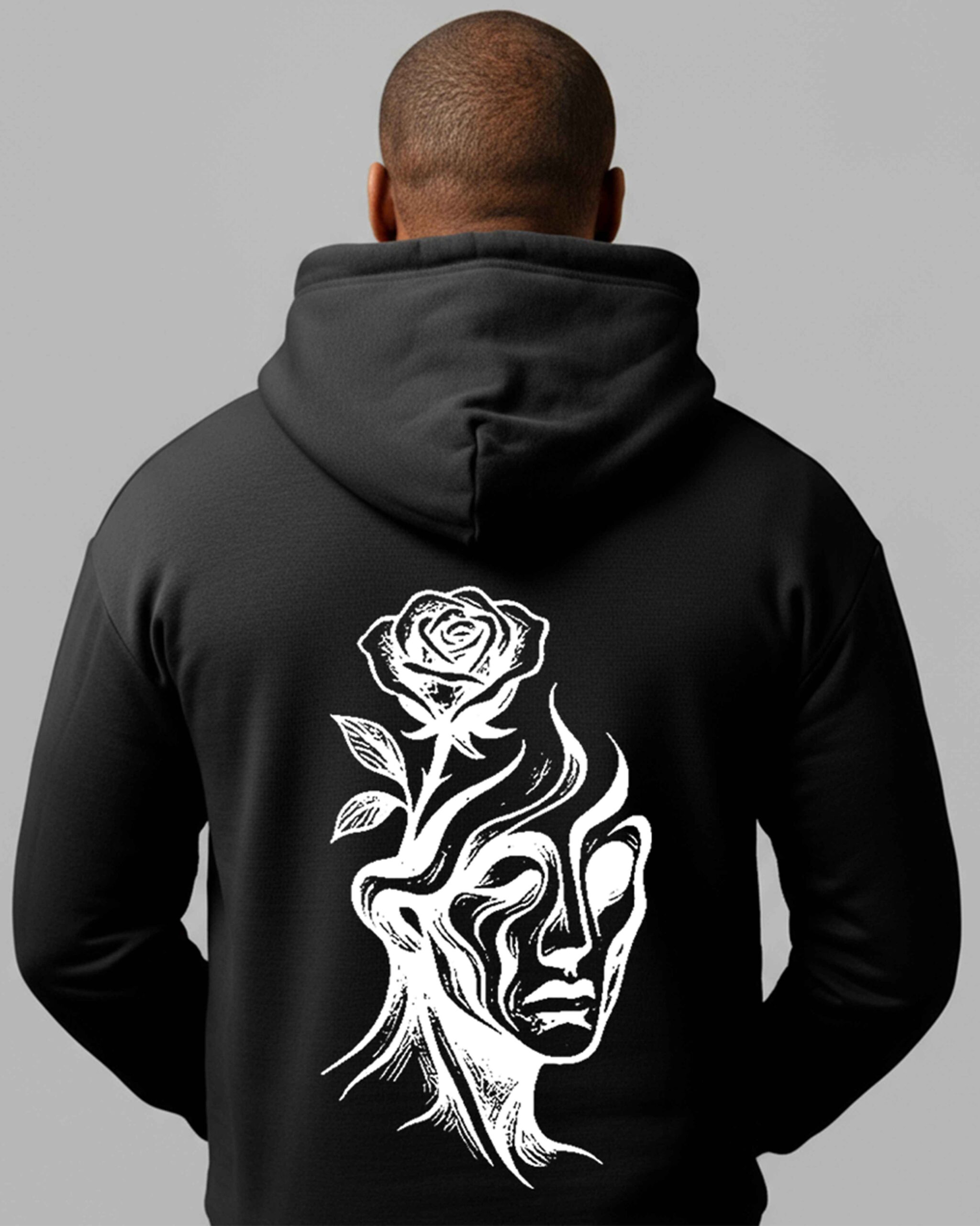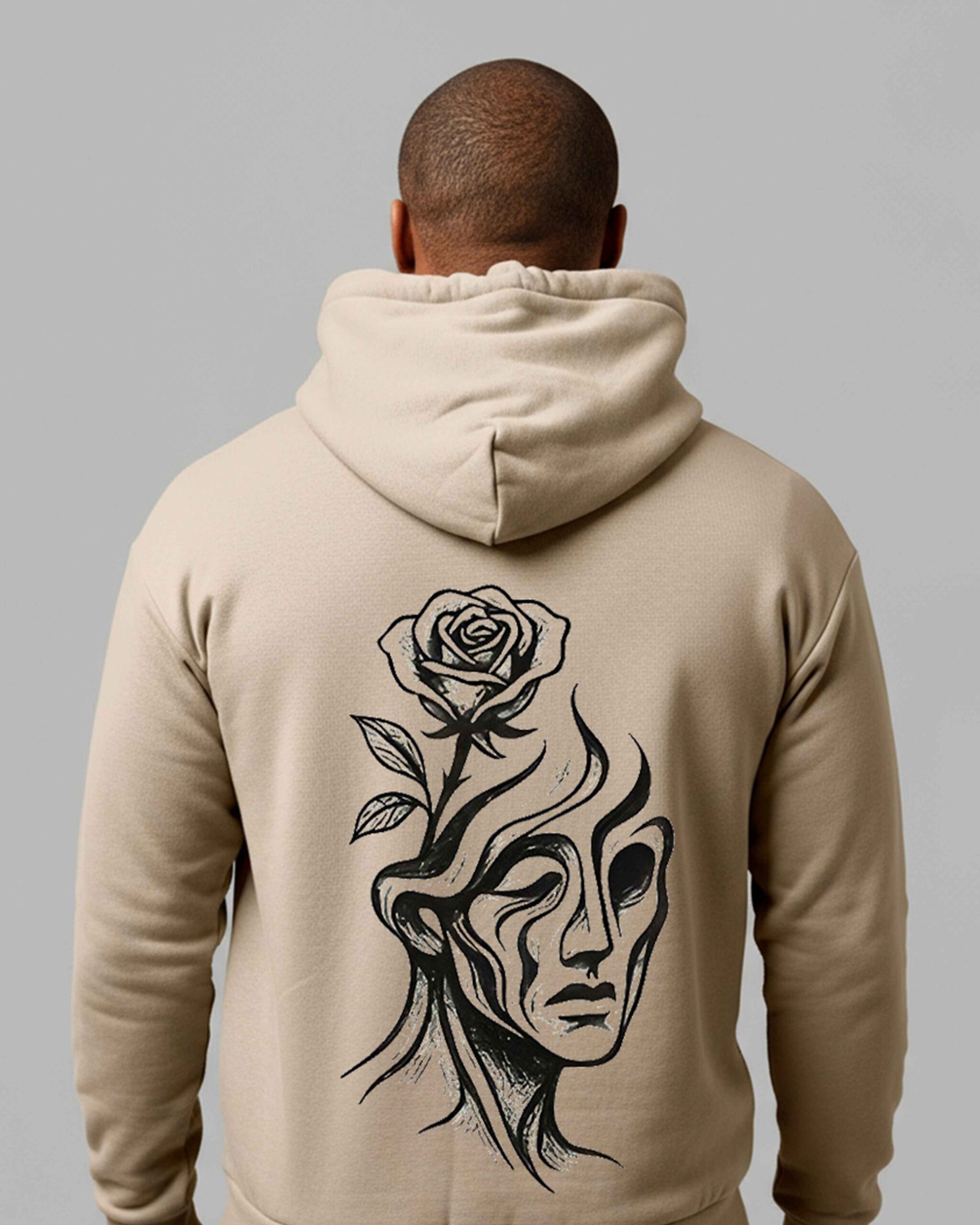 SURREAL FACE DISSOLVING INTO ORGANIC CURVES, ROSE BLOOMING FROM THE MIND
