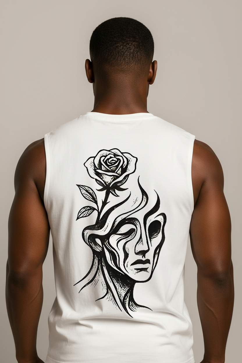 Artwork: Surreal face dissolving into organic curves, rose blooming from the mind