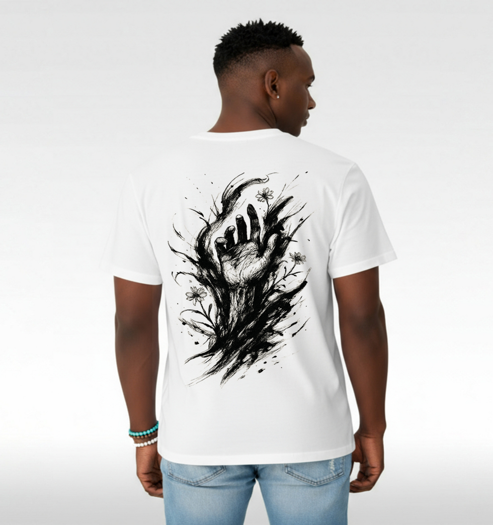Artwork: Expressive hand emerging from abstract darkness with subtle flowers