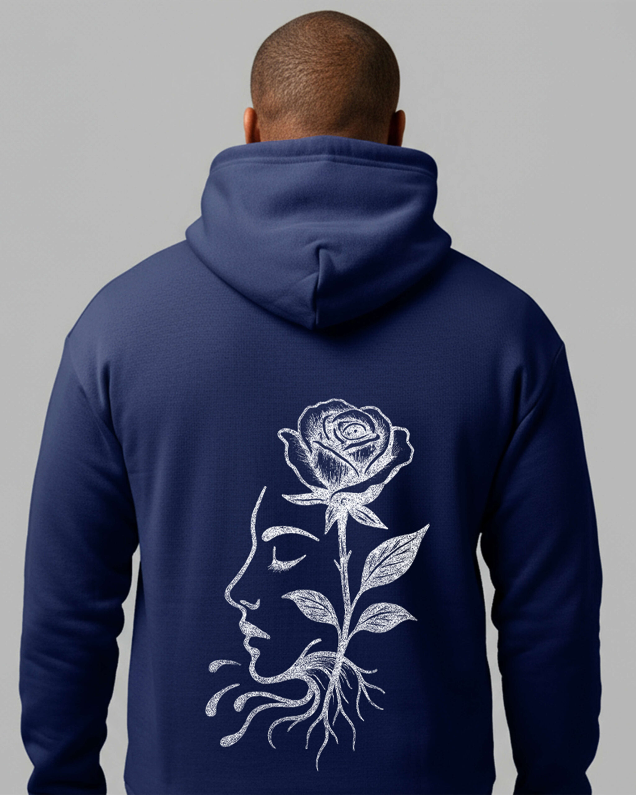 A SERENE PROFILE WHERE A SINGLE ROSE RISES THROUGH THE MIND, ITS ROOTS FLOWING FREELY—GROWTH ANCHORED IN CALM AWARENESS.
