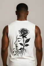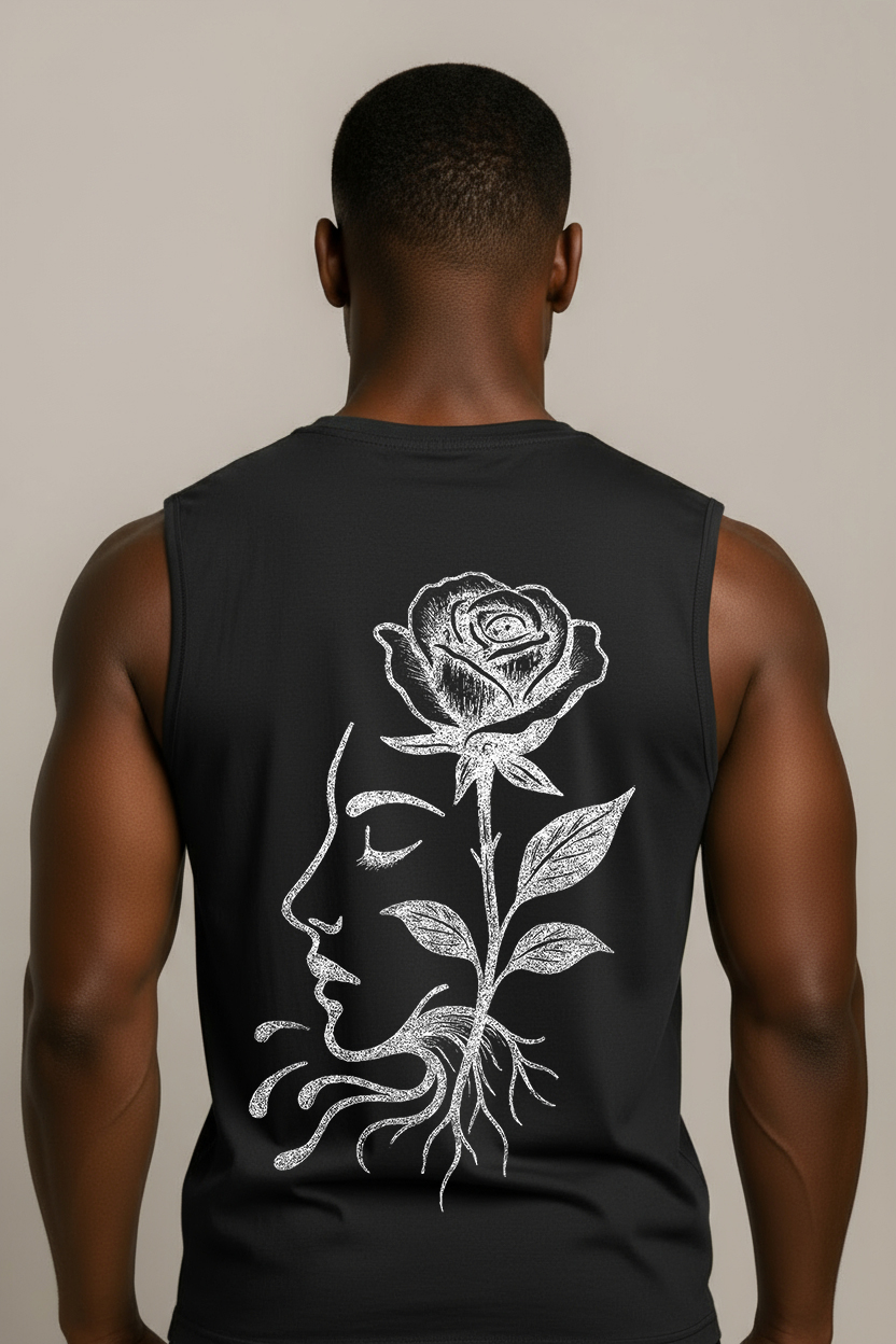 A SERENE PROFILE WHERE A SINGLE ROSE RISES THROUGH THE MIND, ITS ROOTS FLOWING FREELY—GROWTH ANCHORED IN CALM AWARENESS.