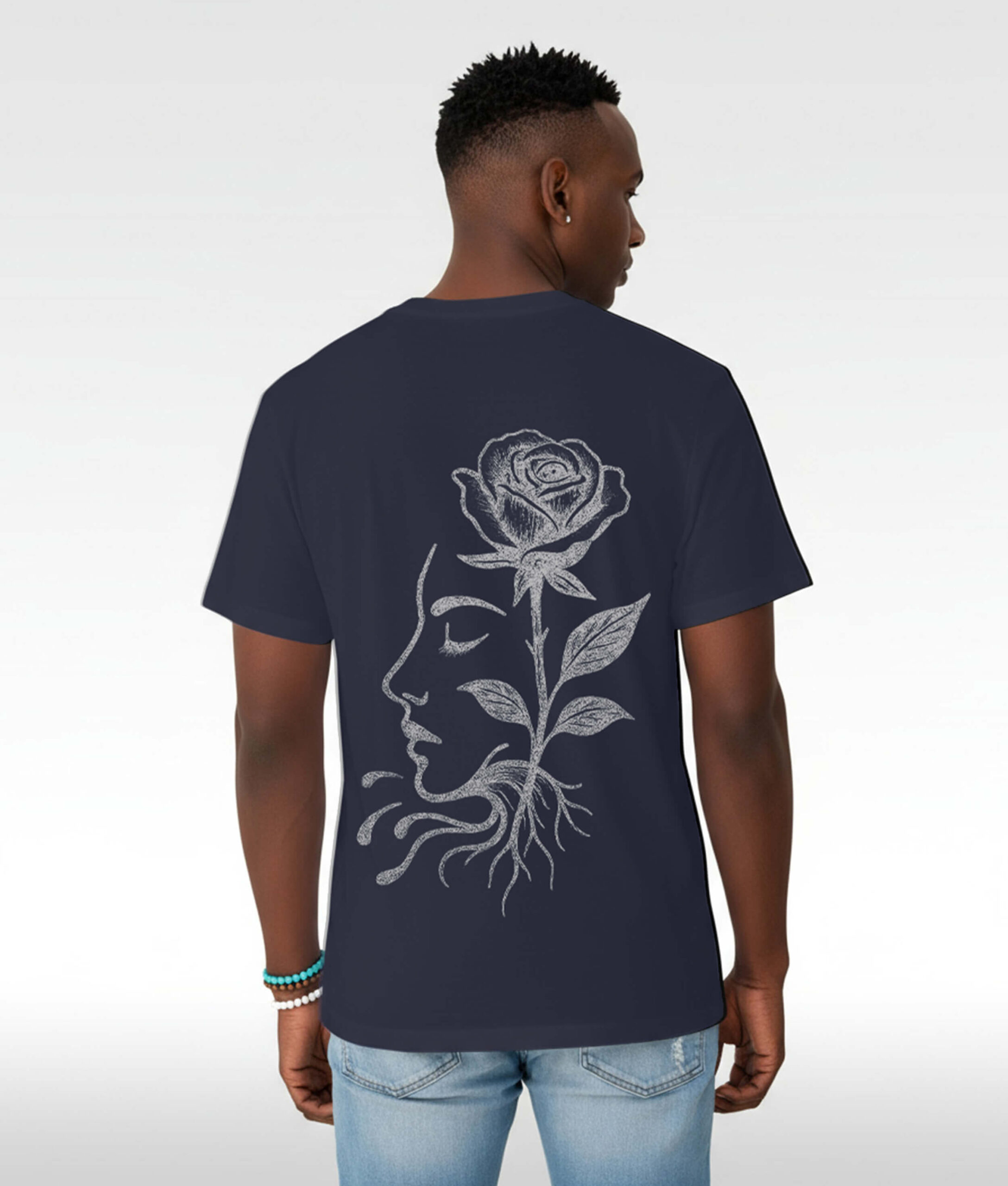 A SERENE PROFILE WHERE A SINGLE ROSE RISES THROUGH THE MIND, ITS ROOTS FLOWING FREELY—GROWTH ANCHORED IN CALM AWARENESS.
