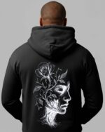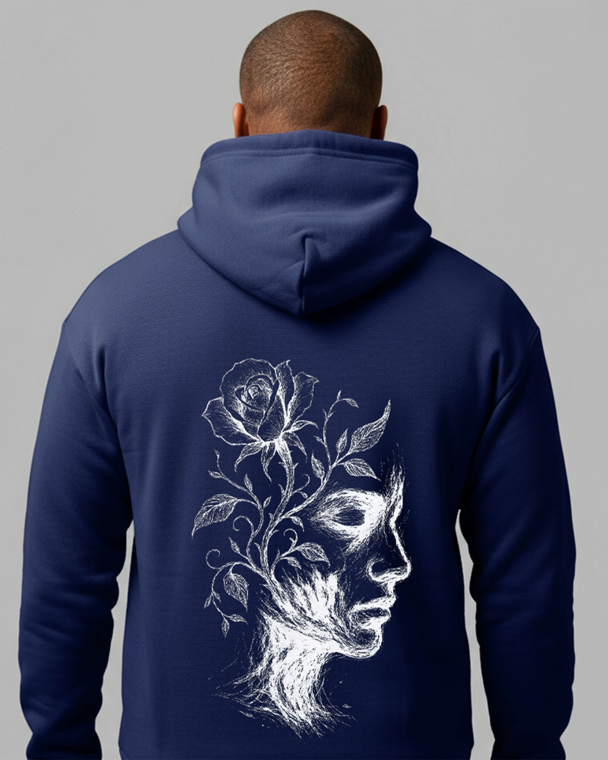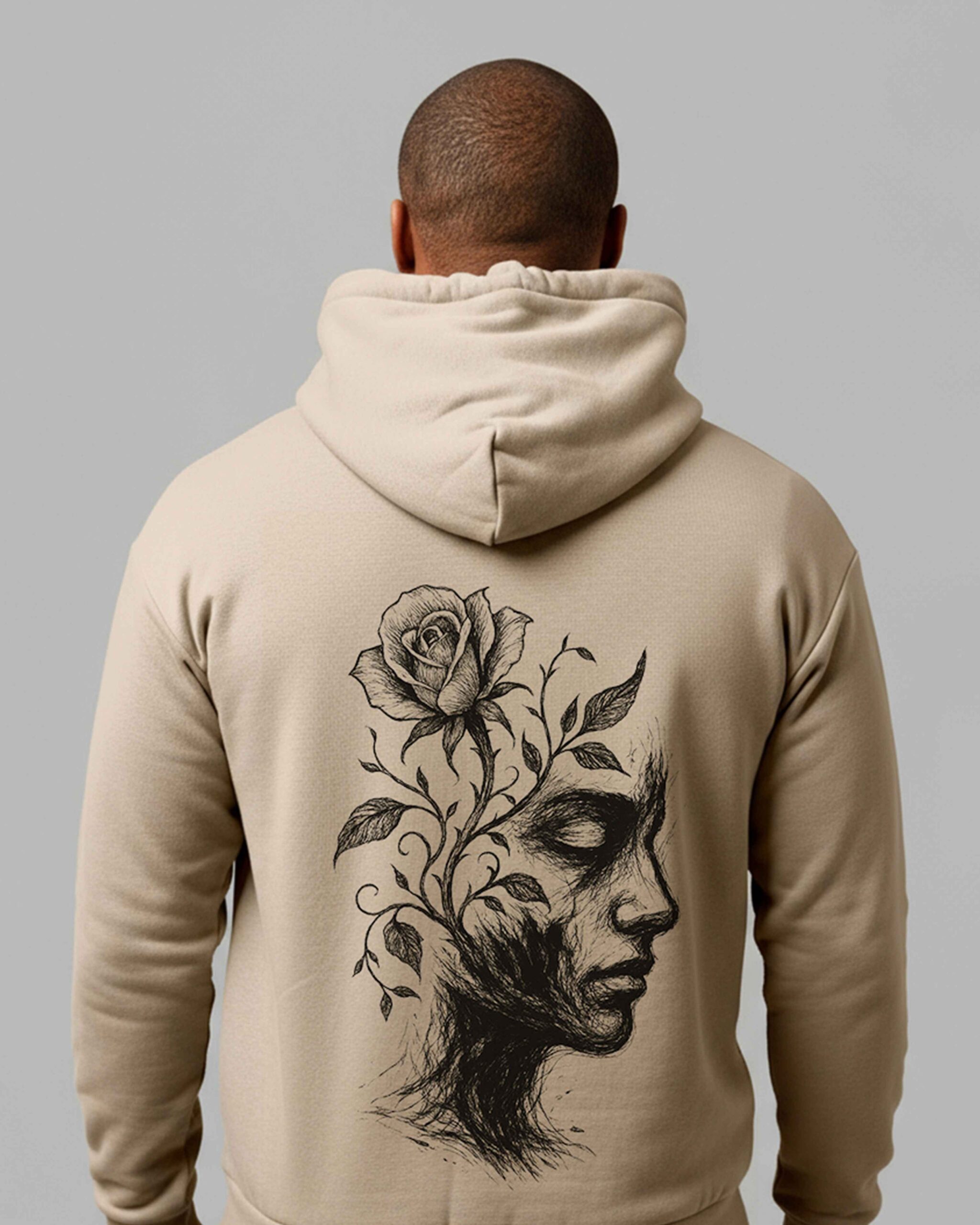 Artwork: Abstract female face dissolving into flowing lines, crowned by a single rose — identity blending with growth