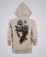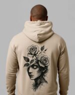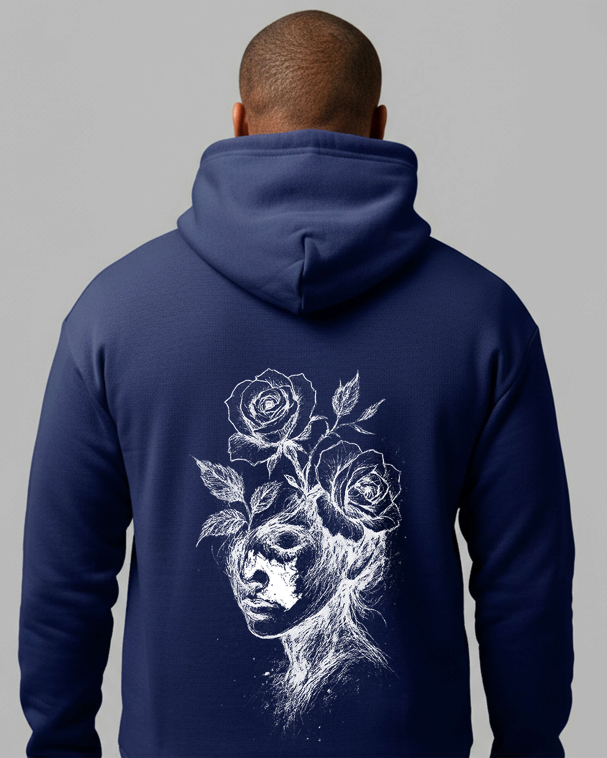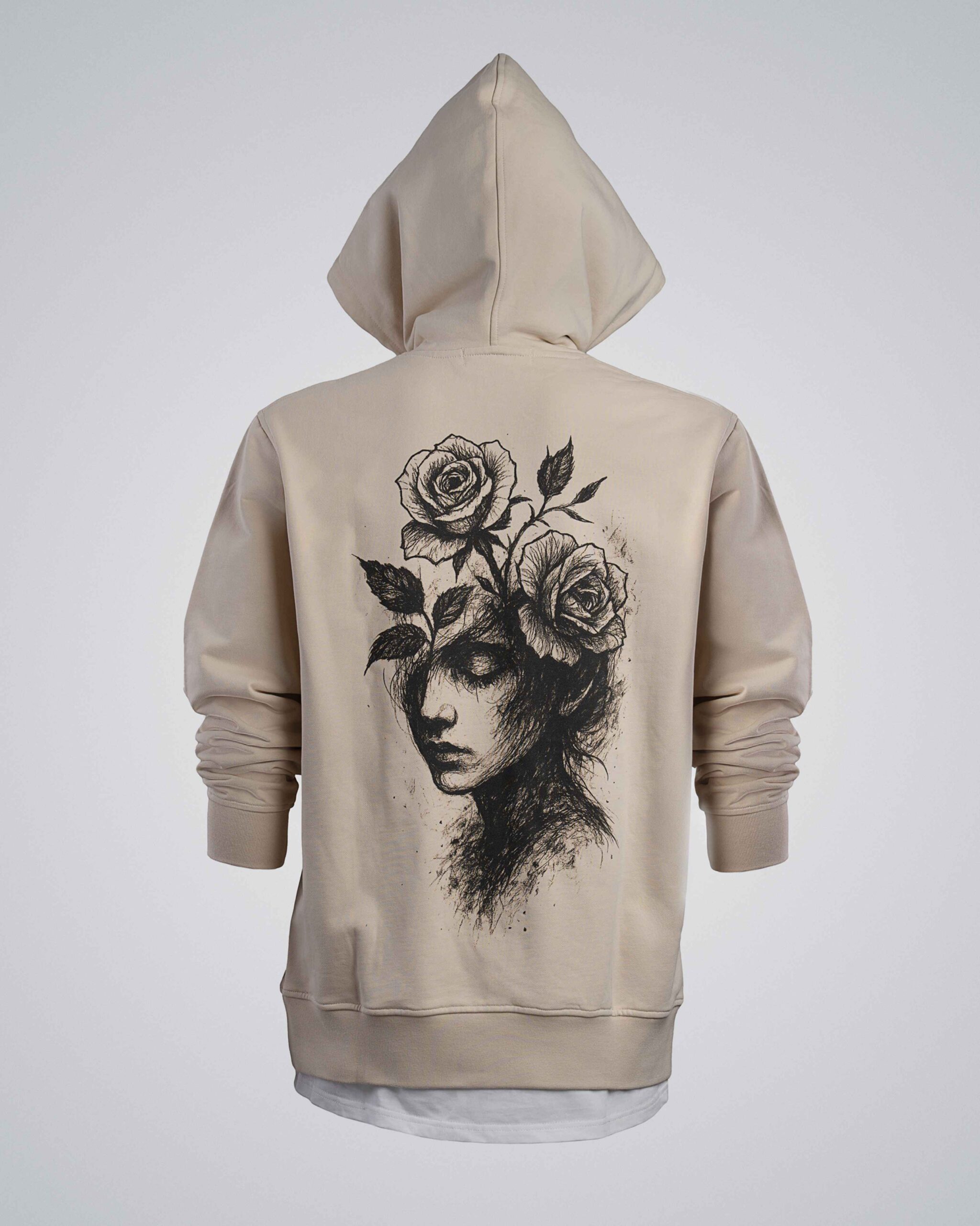 A SHADOWED FEMININE FACE PARTIALLY CONSUMED BY TEXTURED DARKNESS, CROWNED WITH BLOOMING ROSES — BEAUTY EMERGING THROUGH EMOTIONAL WEIGHT.