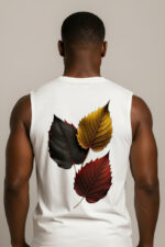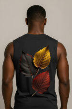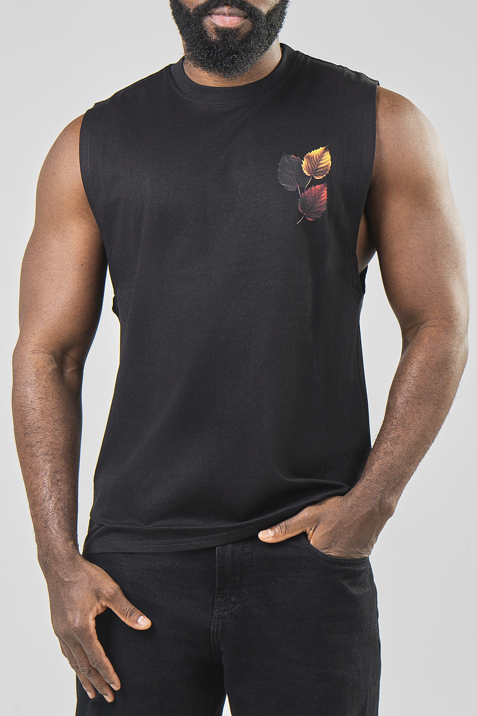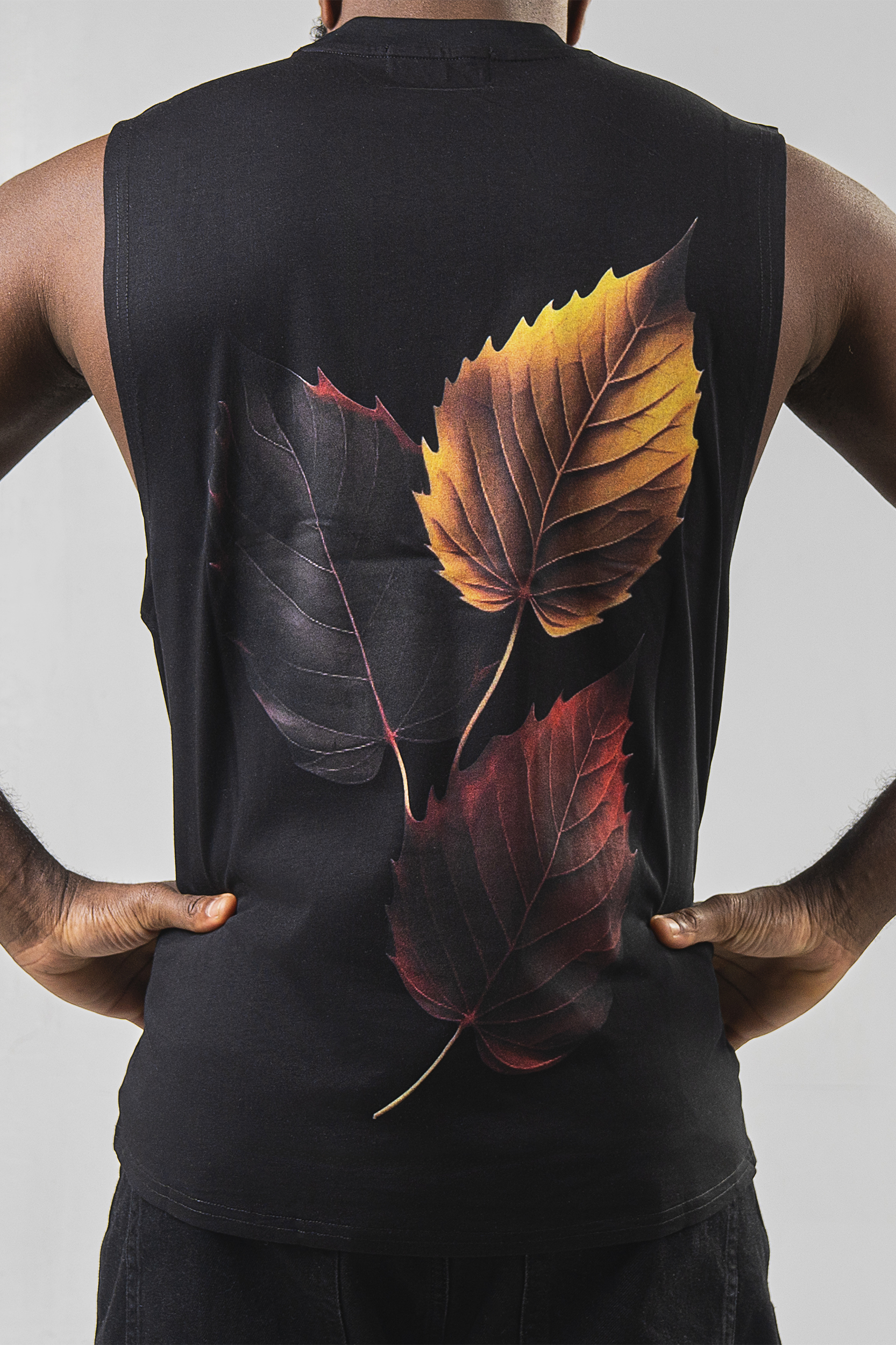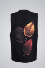 Artwork: Three autumn leaves in black, gold, and red