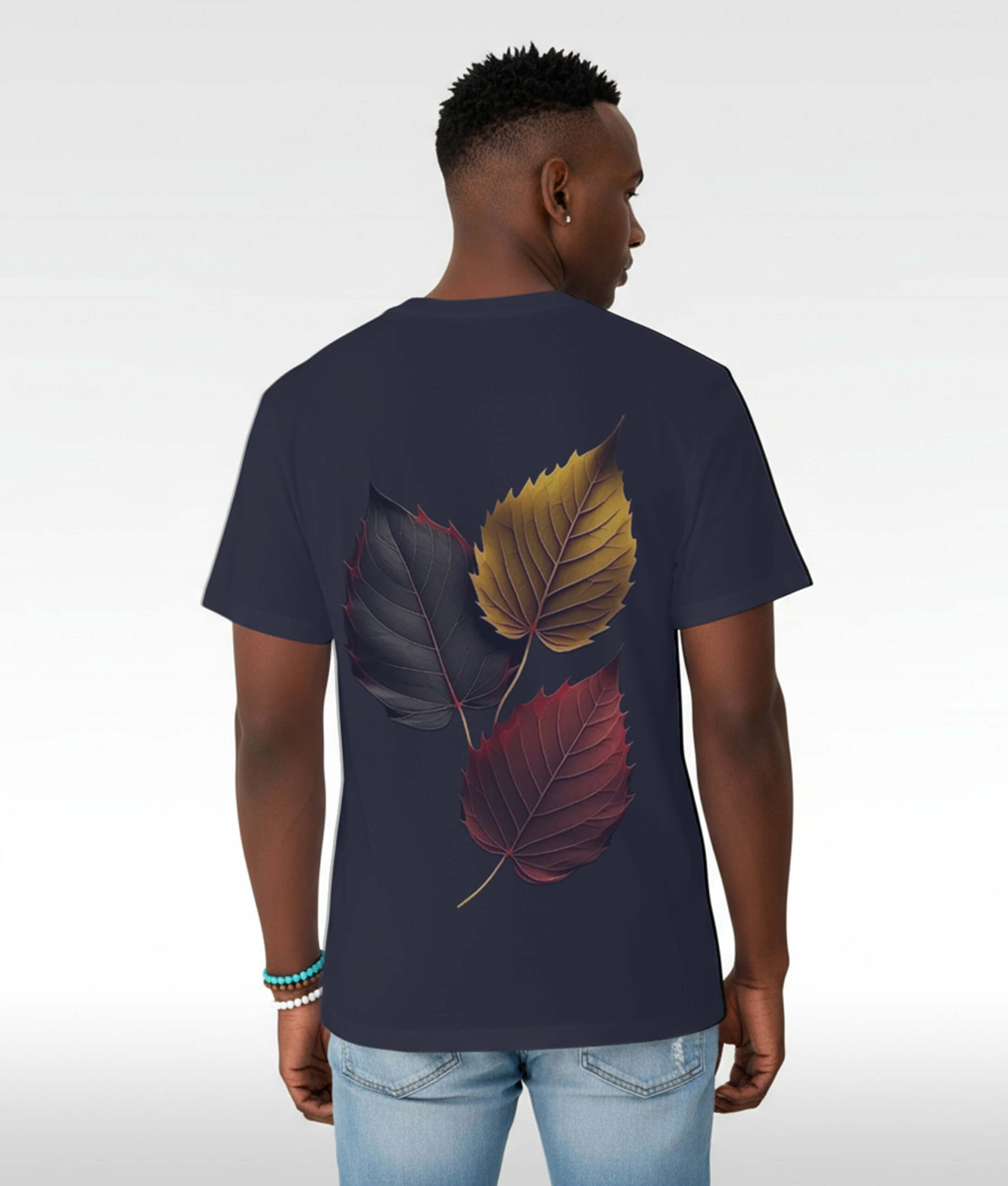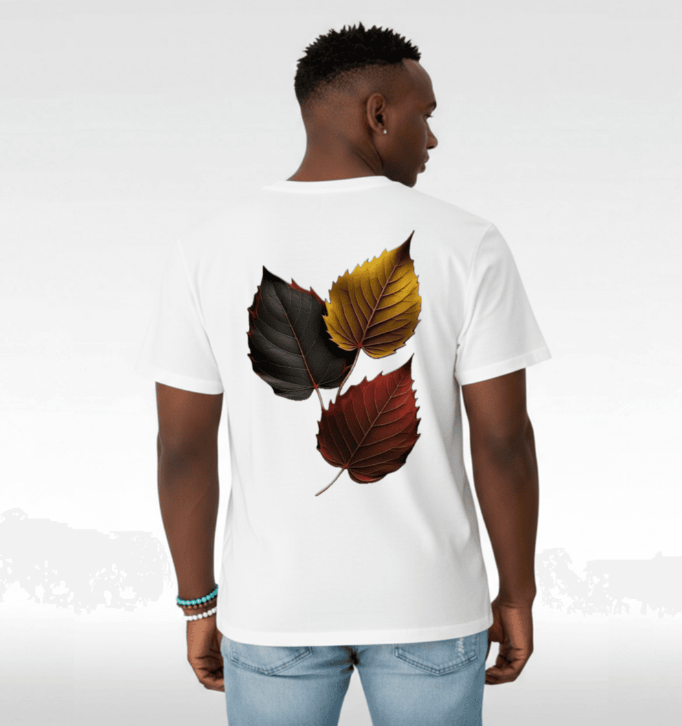 Artwork: Three autumn leaves in black, gold, and red